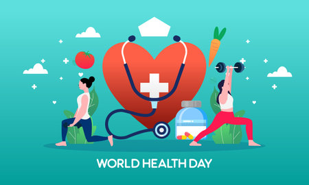 A vibrant and lively illustration that commemorates World Health Day, featuring symbols of healthcare and wellness