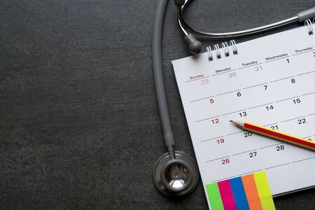 Top view of stethoscope and calendar on the black background, schedule to check up healthy concept