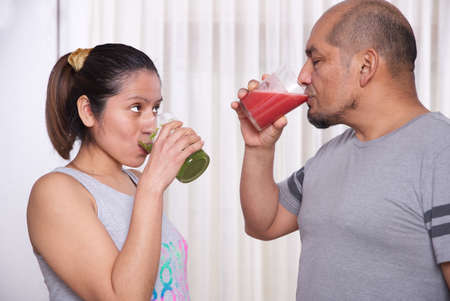 Couple drinking green and strawberry smoothies after physical activity