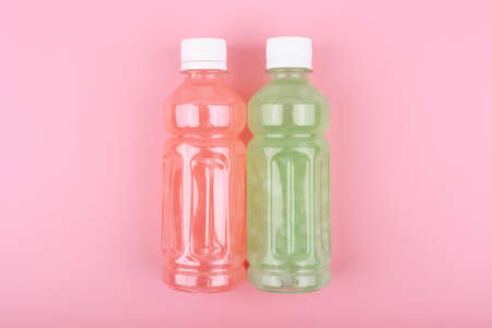 Two multicolored detox drinks or healthy smoothies in transparent plastic bottles on pink background