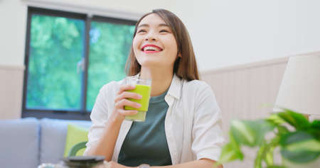 asian woman is drink green tea with glass cup while relaxing at home