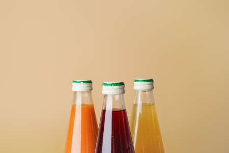 Bottles of juices on color background