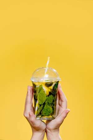 Mojito cocktail in a plastic glass with a tube on a yellow background. ? ool drink in the summer for takeaway. Place for text.