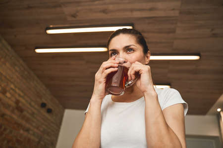 Low angle of a thoughtful young Caucasian female drinking herbal tea from a glass cup