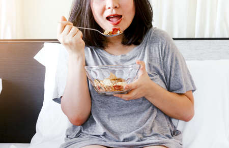 Concept food good healthy for weight loss. Smile obesity plus size women eat green organic vegetables while sitting on the white bed. Fat female holding glass bowl with salad vegetarian.