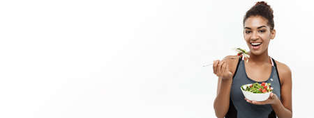 Healthy and Fitness concept - Beautiful American African lady in fitness clothes on diet eating fresh salad. Isolated on white background.