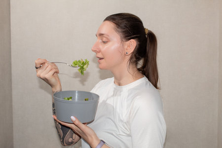Portrait of a cheerful woman eating healthy salad. Concept of losing weight, sports and healthy eating. High quality photo.