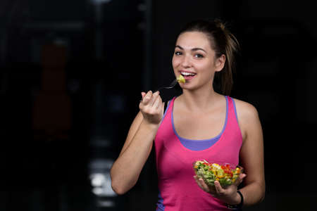 Young beutiful woman is eating salad for a fit body and healthy life. High quality photo