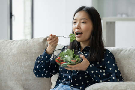 Young happy Asian woman eating healthy salad sitting on the sofa in living room.