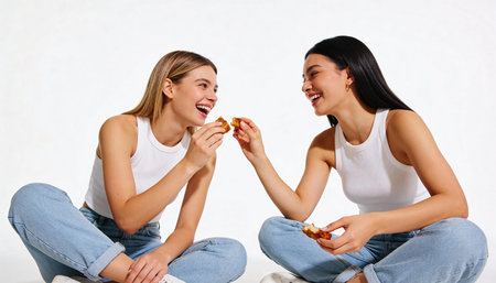 Two beautiful young women sitting on the floor and eating pizza. White background.