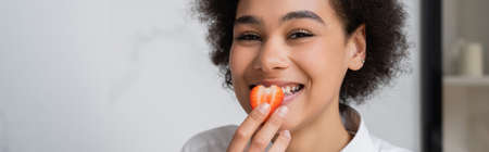 happy african american woman eating fresh strawberry and looking at camera, banner