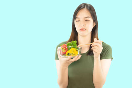 Diet concept by eat healthy salad. Young woman holding dish vegetable for healthy diet with smile in healthcare.