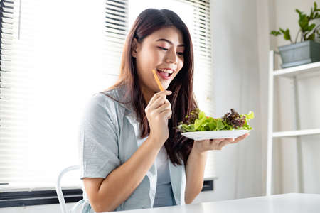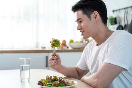 Asian young happy attractive man eat green salad in kitchen at home. Handsome male sit on table feeling enjoy eating vegetables healthy foods to diet and lose weight for health care wellness in house.