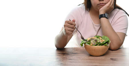 Cropped shot of overweight woman is eating vegetarian salad for weight loss and health.