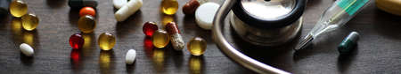 Assortment of herbal and traditional medicine on colorful background. Traditional healthcare concept. Natural homoeopathic remedies. Top view, flat lay, panorama