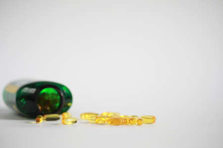 Pharmaceutical, branding and science concept - Vitamin D and golden Omega 3 pills for healthy diet nutrition, fish oil food supplement pill capsules, healthcare and medicine as pharmacy background