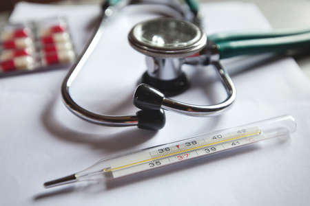 Close-up of a glass of water, pills, a blood pressure monitor and an oxyometer. Selective focus. The concept of health