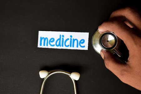 Conceptual image with Medicine inscription with the view of stethoscope, in someone hand with black background. Medical Conceptual.