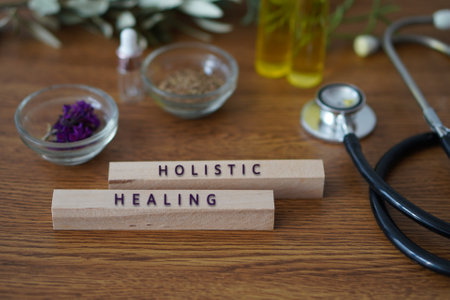 HOLISTIC HEALING words written on wooden blocks on a table with plants, herbs, natural oils and a stethoscope.