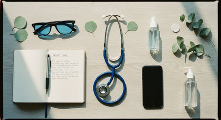 Stethoscope, stethoscope, glasses, eucalyptus leaves, bottle of sanitizer and notebook on wooden table. Top view