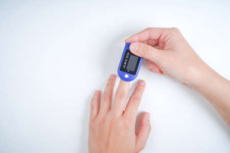 Patient women using fingertip pulse oximeter oxygen saturation meter SPO2 PR blood monitor finger on white background