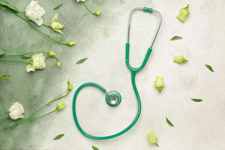 Medical concept: celebrating Christmas in healthcare. Top view of a flat lay close-up of a stethoscope, pulse oximeter with fir branches on a green background. copy space