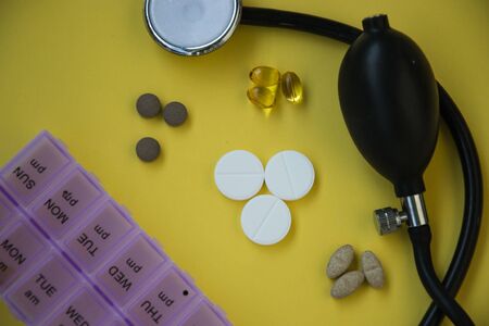 Bunch of pills and capsules, box for storage of drugs and medical stethoscope and blood pressure meter on yellow background, healthcare concept