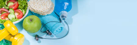 Healthy food and exercising equipment. Concept of healthy lifestyle. Flat lay, top view, copy space, panorama