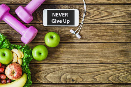Fitness, healthy and active lifestyles Concept, dumbbells, smartphone, fruits and vegetable on wood background. copy space, top view with Never Give up text