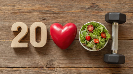 This vibrant arrangement showcases the number 20, a red heart, a fresh salad bowl, and a dumbbell, symbolizing a commitment to health and fitness.