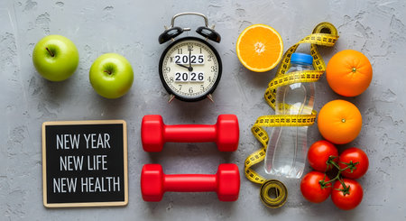 Healthy new year concept featuring apples oranges dumbbells and measuring tape for motivation and wellness inspiration