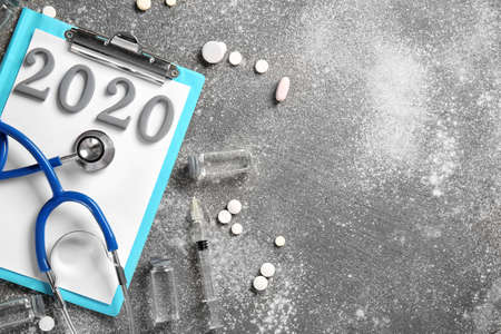 Stethoscope, clipboard, drugs and figure 2020 on gray background