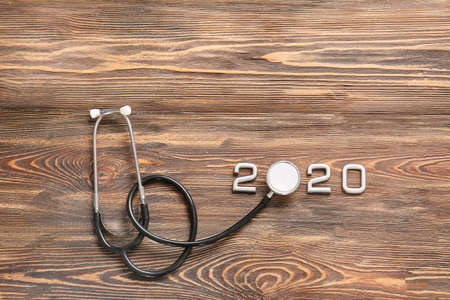 Stethoscope and figure 2020 on wooden background