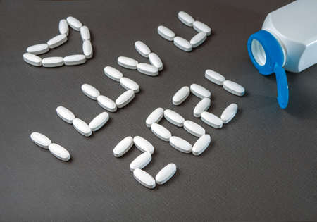 Health spelled with capsules on a white background, medical concept.