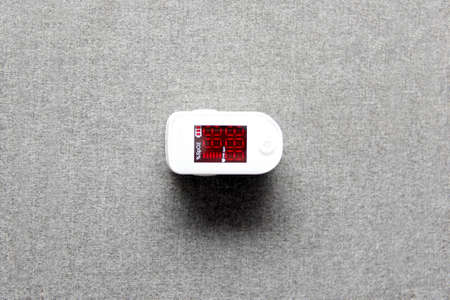 Medical fingertip pulse oximeter tool for oxygen saturation check during covid virus desease. SpO2 monitoring and heart rate measurement instrument on light background with copy space.