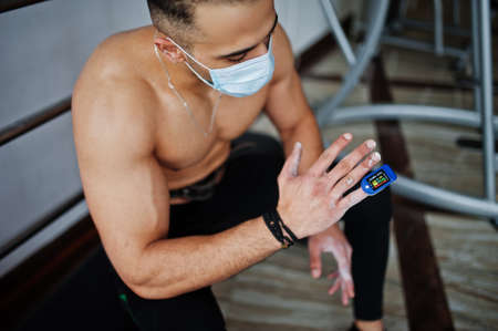 Muscular arab man, wear medical face mask with pulse oximeter in finger in modern gym. Fitness arabian men with naked torso doing exercises, durig coronavirus pandemic.