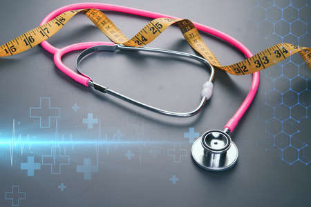 Image of pink stethoscope, measurement tape and heartbeat pulse. medical and healthcare diagnostic concept. Healthy lifestyle and futuristic diet symbol..