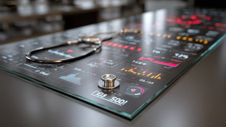 This image showcases a sleek, high-tech medical dashboard featuring a stethoscope, digital metrics, and health data analytics, perfect for innovative healthcare solutions.