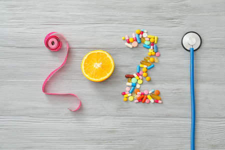 3d rendering of numbers 2022 and ECG monitor on blue background