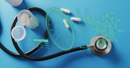 Image of data processing and scope scanning over pills and stethoscope. Global medicine and digital interface concept digitally generated image.