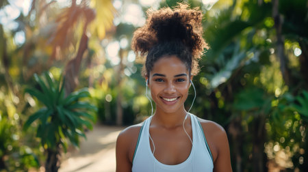 A joyful, dark-skinned woman with long, straight hair, wearing a colorful bikini top, cap, and showing a toned figure and ample breasts.
