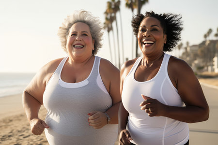 A group of friends enjoys a vibrant morning jogging along the sandy beach. The sun shines brightly, casting a warm glow on their laughing faces. The woman in front, dressed in white, radiates joy as they embrace fitness together.