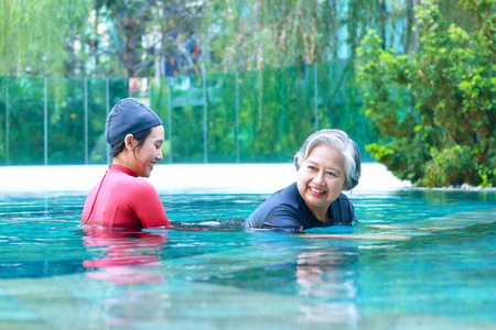 Asian woman or physiotherapist helping elderly female patient with hydrotherapy It is a rehabilitation and exercise in the water. physical therapy center
