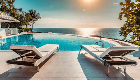Seaside Relaxation, Poolside Cocktails, Tropical Breeze, Golden Hour A serene beach scene with a luxurious poolside setup, guests lounging on comfortable chairs