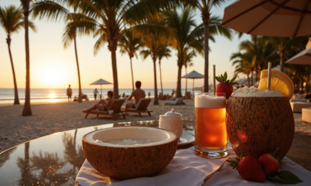 Tropical Beach Bar, Coconut Drinks, Sunset Celebration A tropical beach bar scene with drinks served in coconuts, adorned with tropical fruit garnishes, people