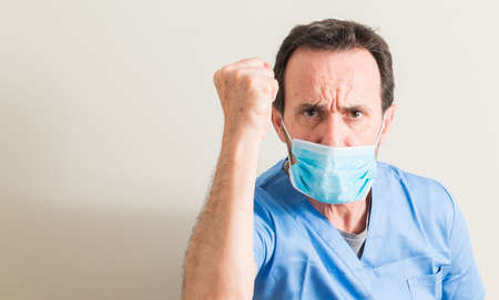 Senior doctor man using mask annoyed and frustrated shouting with anger, crazy and yelling with raised hand, anger concept