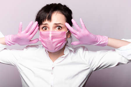 girl in a white shirt, pink medical mask and gloves