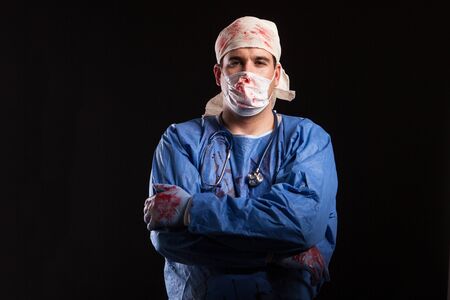 Doctor covered in blood with mask on his face for halloween in studio. Portrait of a doctor looking like a scewball.