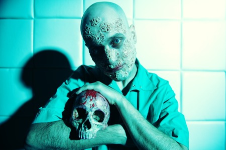 A portrait of a sick scientist after a failed experiment in the blue light holding a skull. desperation, hopelessness. Horror, halloween.