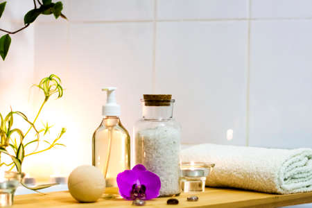 Spa-beauty salon, wellness center. Spa treatment aromatherapy for a woman's body in the bathroom with candles, oils and salt. Lifestyle and cosmetic concept
